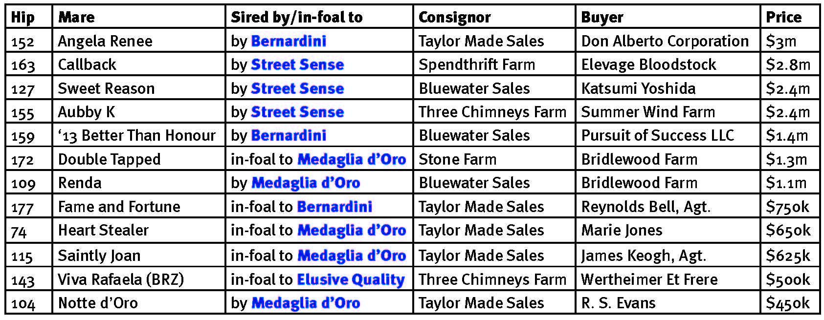 The November mixed sales are once again in full throttle and Darley sires are making their presence felt both as sires and as covering sires. Fasig-Tipton on Sunday held their annual November Sale which featured a number of Darley-sired top-quality racing/broodmare prospects in addition to a treasure trove of Darley in-foal mares. Following is a list of Darley-related mares that reflects strong results at the sale. All four of the top-priced mares - Angela Renee, Callback, Sweet Reason and Aubby K - won at the highest level: